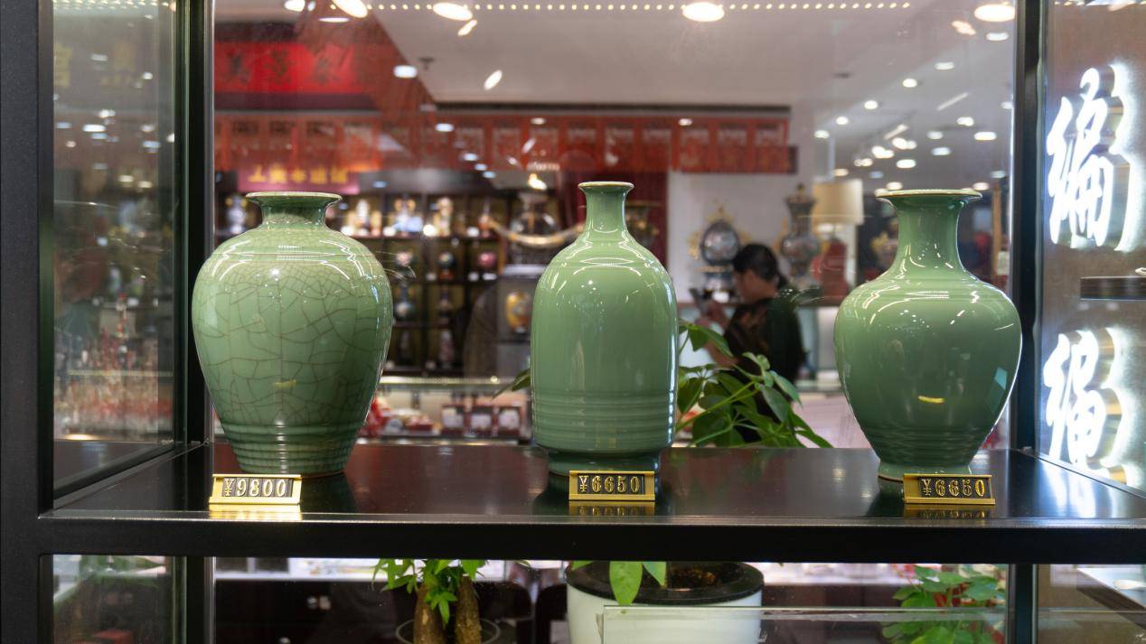 陈烈汉首创的“青瓷青花”、“青瓷描金”、“青瓷红绿彩”、“青瓷绞胎”等技法,打破了龙泉青瓷传统装饰的局限,赋予其更丰富的艺术语言。专卖店内,《凤舞九天》以温润如玉的釉色与灵动的双耳装饰展现东方气韵;《绞胎碗口瓶》则通过两种泥料绞缠,让瓶身布满自然又独特的纹路,诠释现代青瓷的先锋美学。