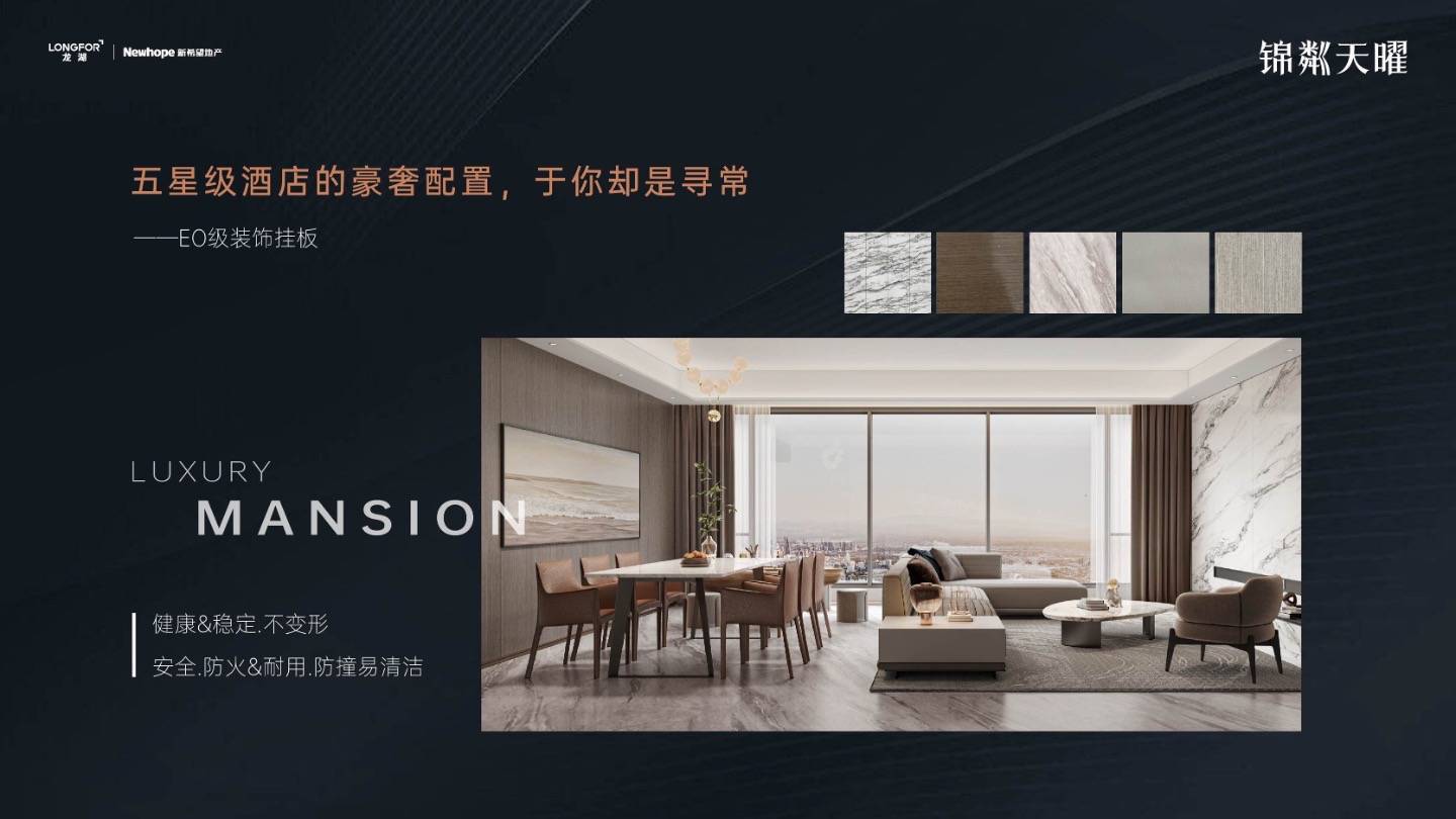 奢石陶瓷大板、E0级装饰挂板、孕婴级环保实木地板、百年德系精工厨卫、无主灯叠级吊顶,臻选世界一线品牌,高定生活质感;