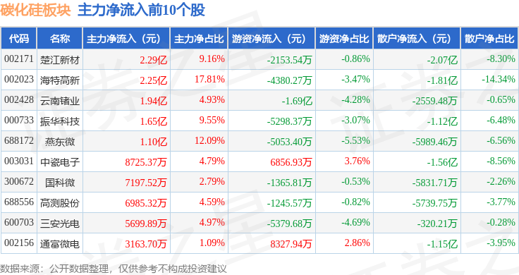 从资金流向上来看,当日碳化硅板块主力资金净流入2.03亿元,游资资金净流入3544.18万元,散户资金净流出2.38亿元。碳化硅板块个股资金流向见下表: