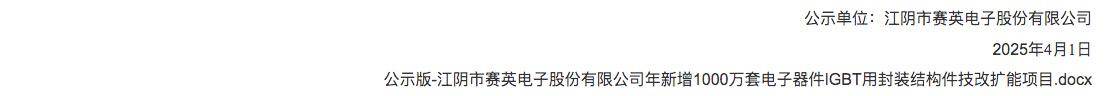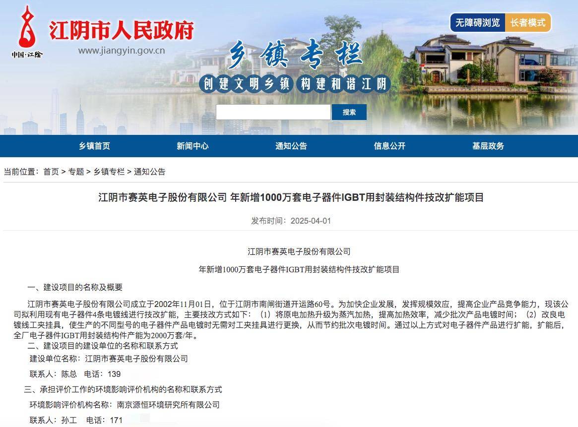 2025年4月1日,江阴市人民政府网站对赛英电子“年新增1000万套电子器件IGBT用封装结构件技改扩能项目”(下称:技改项目)的环评文件进行公示。该环评文件编制于2025年3月,文件内容显示,技改项目体量较小,施工期仅一个月,不新建产线,而是对公司现有的电子器件4条电镀线进行技改,拟将电子器件IGBT用封装结构件的产能从1,000万套/年扩充至2,000万套/年。电子器件IGBT用封装结构件即散热基板。赛英电子没有子公司,技改项目环评提到的4条电镀线恰好与招股书中基板车间的4条电镀线对应。